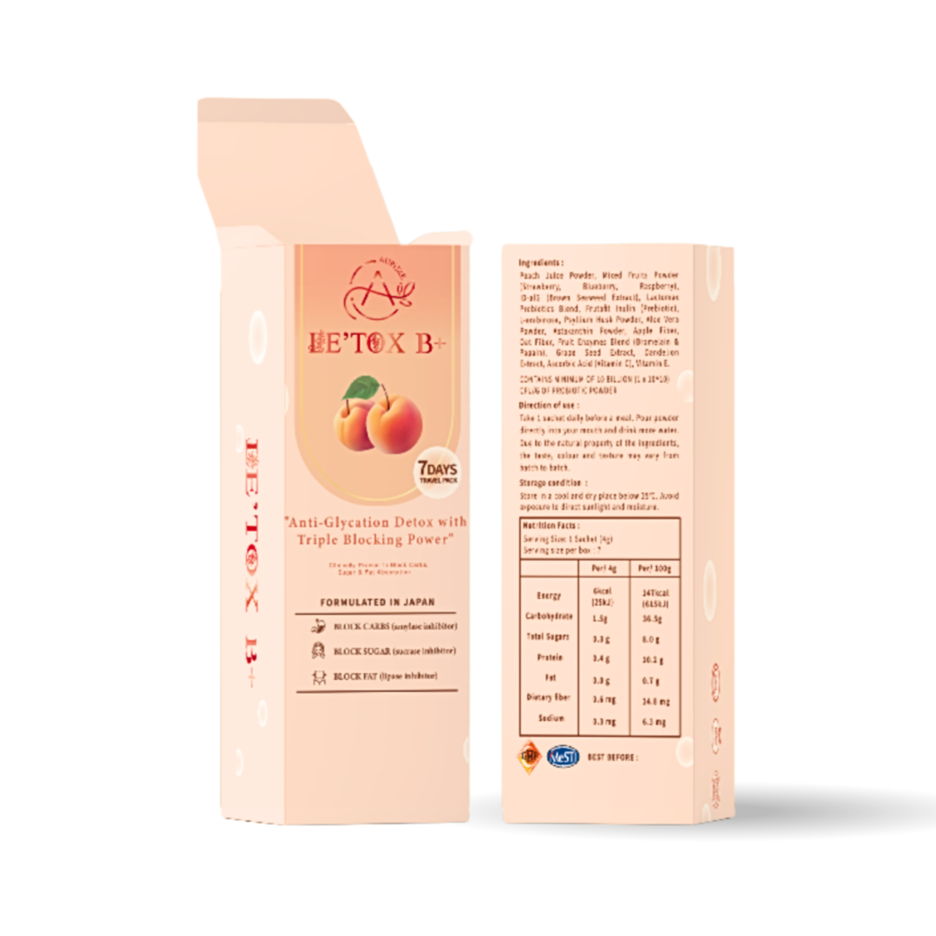L-arabinose, brown algae extract, probiotics, apple fiber, oat fiber, Japanese white peach powder Product specifications: 7 packs in travel box, 15 packs in single box (powder, individually packaged)
